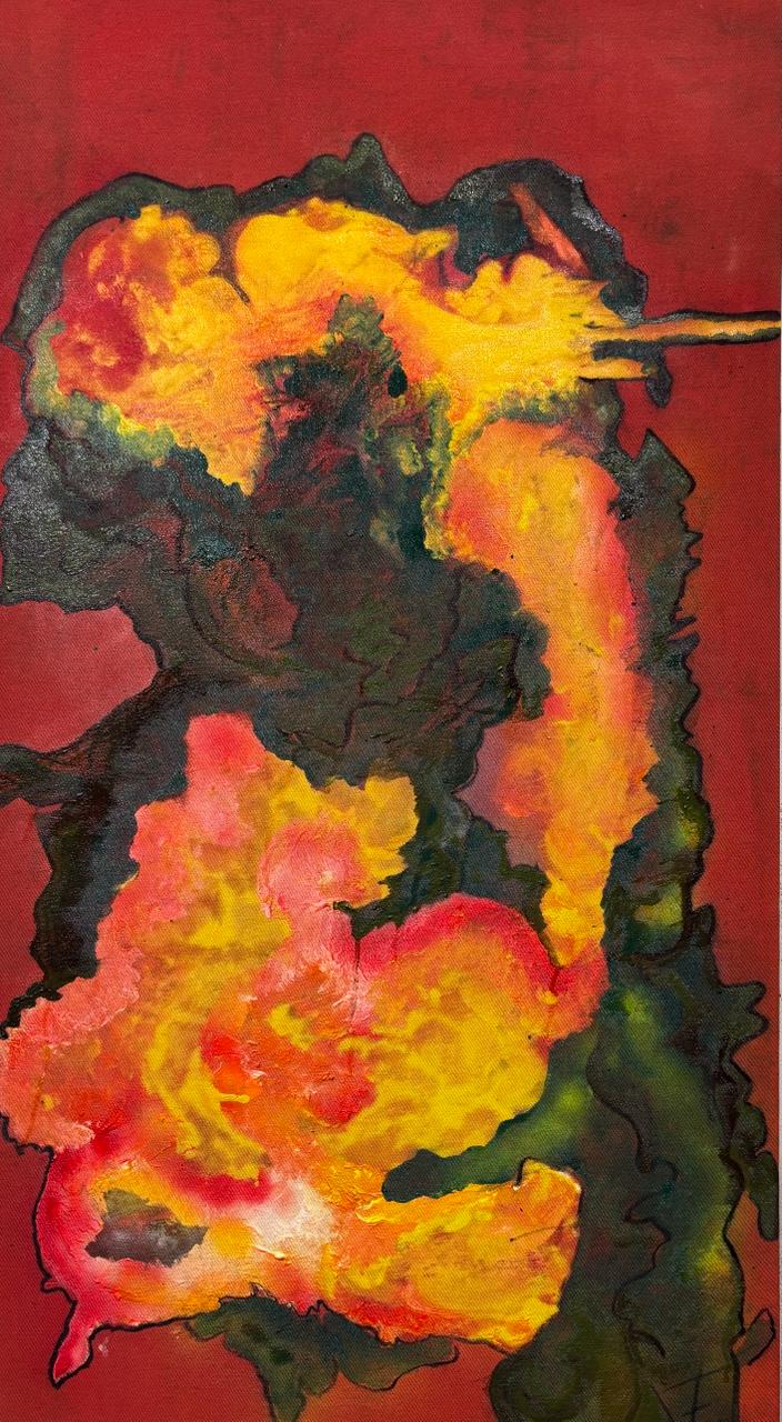 Technique Used: The technique reveals a sophisticated experimental approach combining multiple expressive media on unprimed canvas. The absence of primer is fundamental to the final effect - it allows paints to be absorbed irregularly by the fibers, creating areas of variable saturation that confer organicity to the surface. Oil paint, applied in dense layers, especially in the incandescent yellows and oranges, creates pronounced reliefs that capture and reflect light dramatically. Spray paint introduces a contemporary dimension and more diffused application, possibly responsible for the smooth gradients and color halos emanating from central forms. Enamel, with its glossy finish and ability to create defined contours, seems responsible for the dark, fluid lines that delimit and connect the color eruptions. Mixed media adds textural complexity, creating a tapestry of surfaces varying from opaque to translucent, from dense to airy. The work's imposing height (124 cm) versus its width (63 cm) creates a dominant vertical presence that emphasizes the ascension and verticality of forms.