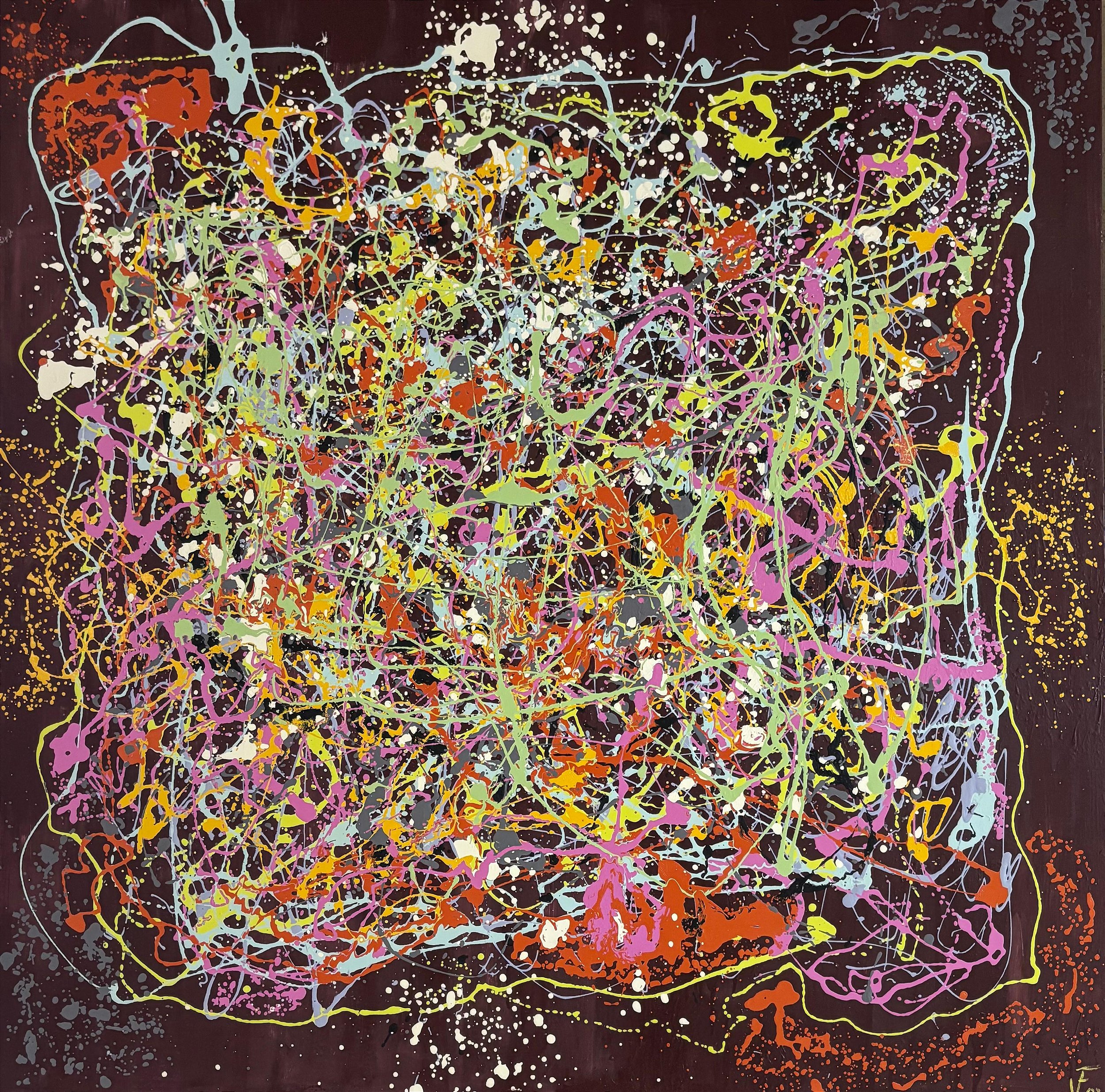 "BACCHUS' FEAST" presents itself as a monumental work that redefines the Dionysian tradition through a contemporary visual language, fusing abstract expressionism with elements of neo-baroque. This imposing composition (150 x 140 cm) executed in oil, enamel, and mixed media on canvas establishes a chromatic field of extraordinary richness, dominated by a deep wine-red background that immediately evokes the sacred nectar of Bacchus. The almost square, slightly vertical format creates an expansive pictorial space that invites the viewer to fully immerse themselves in the sensory experience of Bacchanalian celebration.