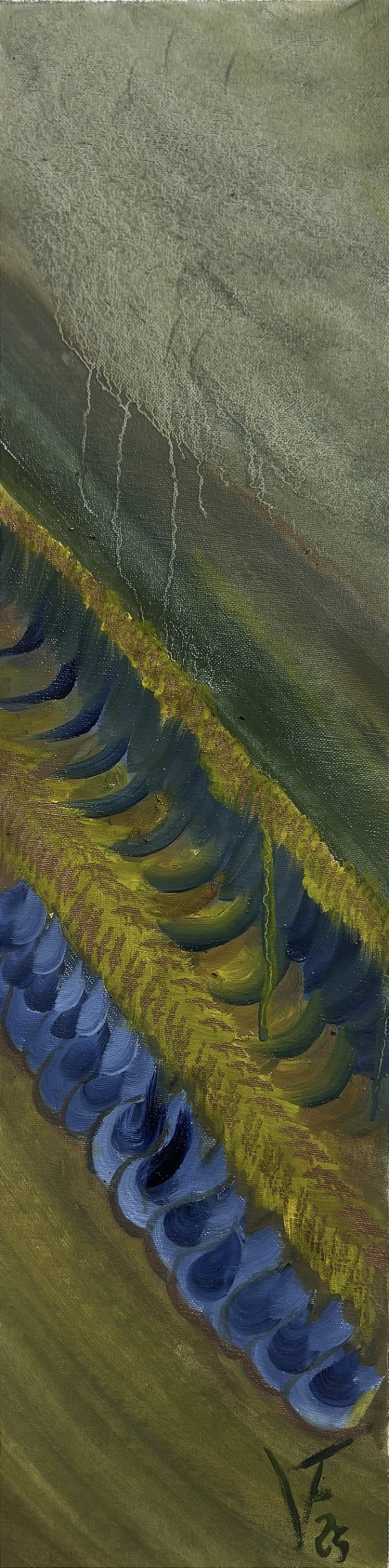 "CASCADE" presents itself as a remarkable work of contemporary abstract expressionism with influences from action painting and Japanese gestural art. This elongated vertical canvas (70 x 28 cm) captures with extraordinary vitality the dynamic and fluid essence of a waterfall, transforming a natural phenomenon into a transcendent visual experience. The artist employs oil and mixed media on canvas with a technique that fuses control and spontaneity, creating a surface where each brushstroke and drip seems to follow the gravitational inevitability of water in motion, resulting in a composition that is simultaneously structured and organic.