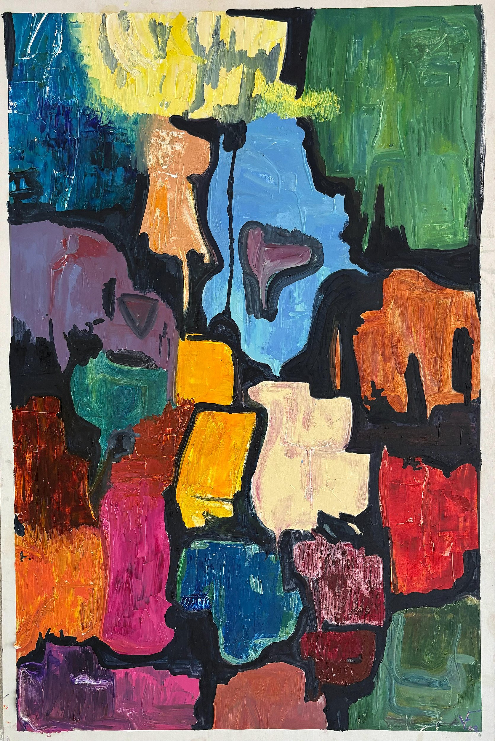 A composição é estruturada em torno de um campo predominantemente negro que ocupa a maior parte da tela, porém este negro revela-se multidimensional e complexo, incorporando sutis variações tonais que sugerem profundidade infinita. Distribuídas estrategicamente ao longo desta superfície aparentemente monocromática, encontram-se intervenções cromáticas vibrantes - fragmentos de vermelho intenso, azul profundo, verde luminoso e amarelo dourado - que emergem como pontos focais que ancoram o olhar do espectador antes de convidá-lo a explorar as regiões mais obscuras da tela. Esta justaposição cria uma tensão visual extraordinária entre contenção e expressão, entre o vazio contemplativo e a explosão emocional representada pelas cores vibrantes.