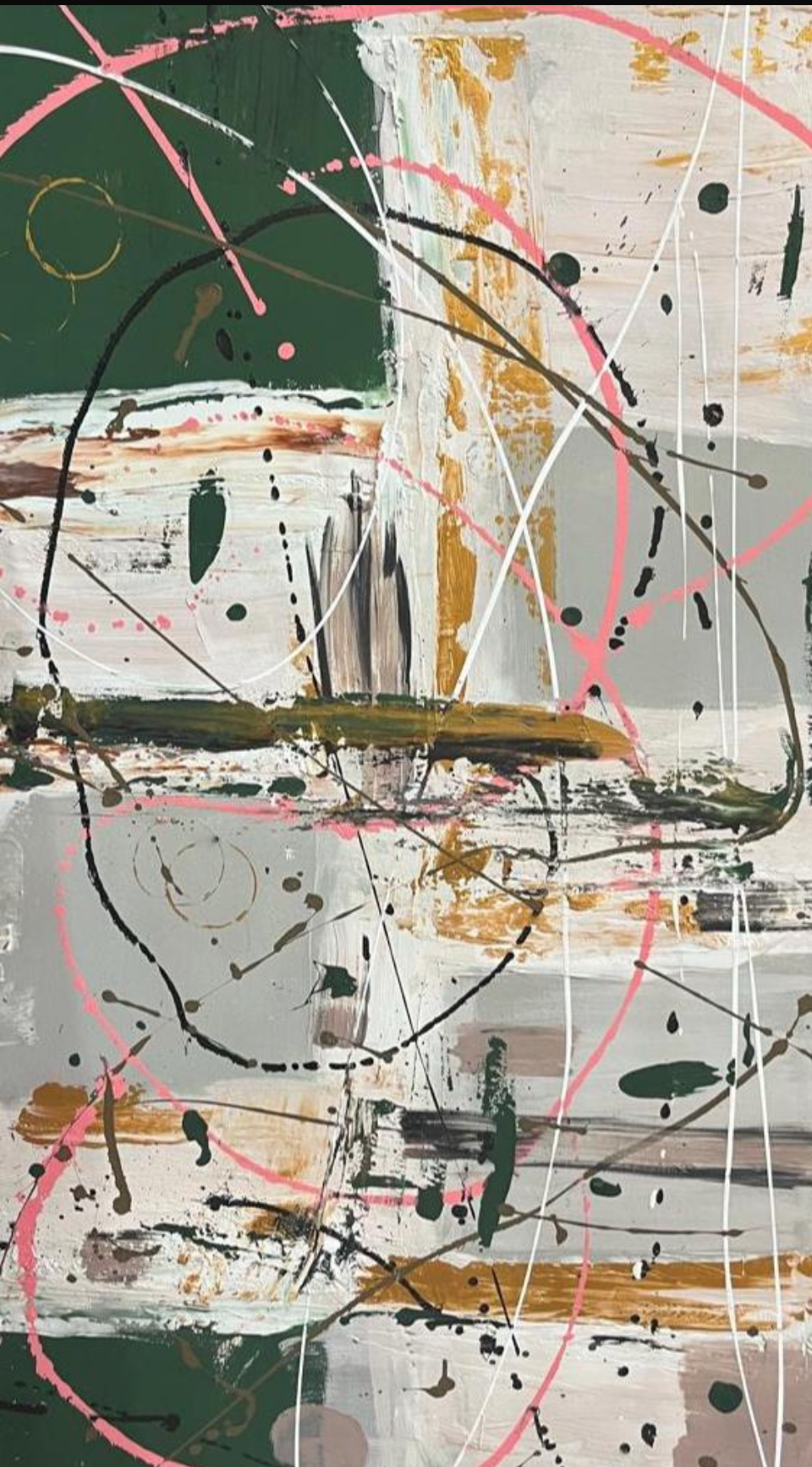 Análise Técnica. A pintura "COSMIC FLOW", datada de 2025 e realizada em óleo sobre canvas, com dimensões de 126x72 cm, é uma obra de grande expressividade e dinamismo. A composição é marcadamente assimétrica e acentua uma sensação de movimento constante. O plano de fundo é construído por blocos de cor mais sólidos – brancos, cinzas, verdes escuros e toques de ouro – que parecem se sobrepor e se interpenetrar, criando uma base texturizada e multicamadas. Sobre essa base, emerge uma explosão de linhas finas e gestuais, respingos e pingos, dançando por toda a superfície. A paleta é simultaneamente terrena e etérea, criando um contraste fascinante: o verde escuro remete à profundidade, o branco e cinza funcionam como espaços de luz e atmosfera, o dourado/ocre introduz calor e luminosidade, e o rosa choque/magenta é a cor mais vibrante, atuando como um raio de energia pulsante. O preto e marrom escuro fornecem ancoragem e contraste. As linhas são extremamente variadas, incluindo traços largos e empastados nos blocos de fundo, linhas finas, fluidas e caligráficas (principalmente em preto, branco, rosa e marrom) que se entrelaçam e cruzam, sugerindo movimento contínuo, e respingos e pingos (splatter) que pontuam a tela. A natureza gestual dessas marcas transmite uma sensação de espontaneidade e emoção. A textura é notável, com o empasto visível em várias áreas, especialmente nos blocos de cor de fundo, e a sobreposição de camadas constrói uma ilusão de profundidade espacial.