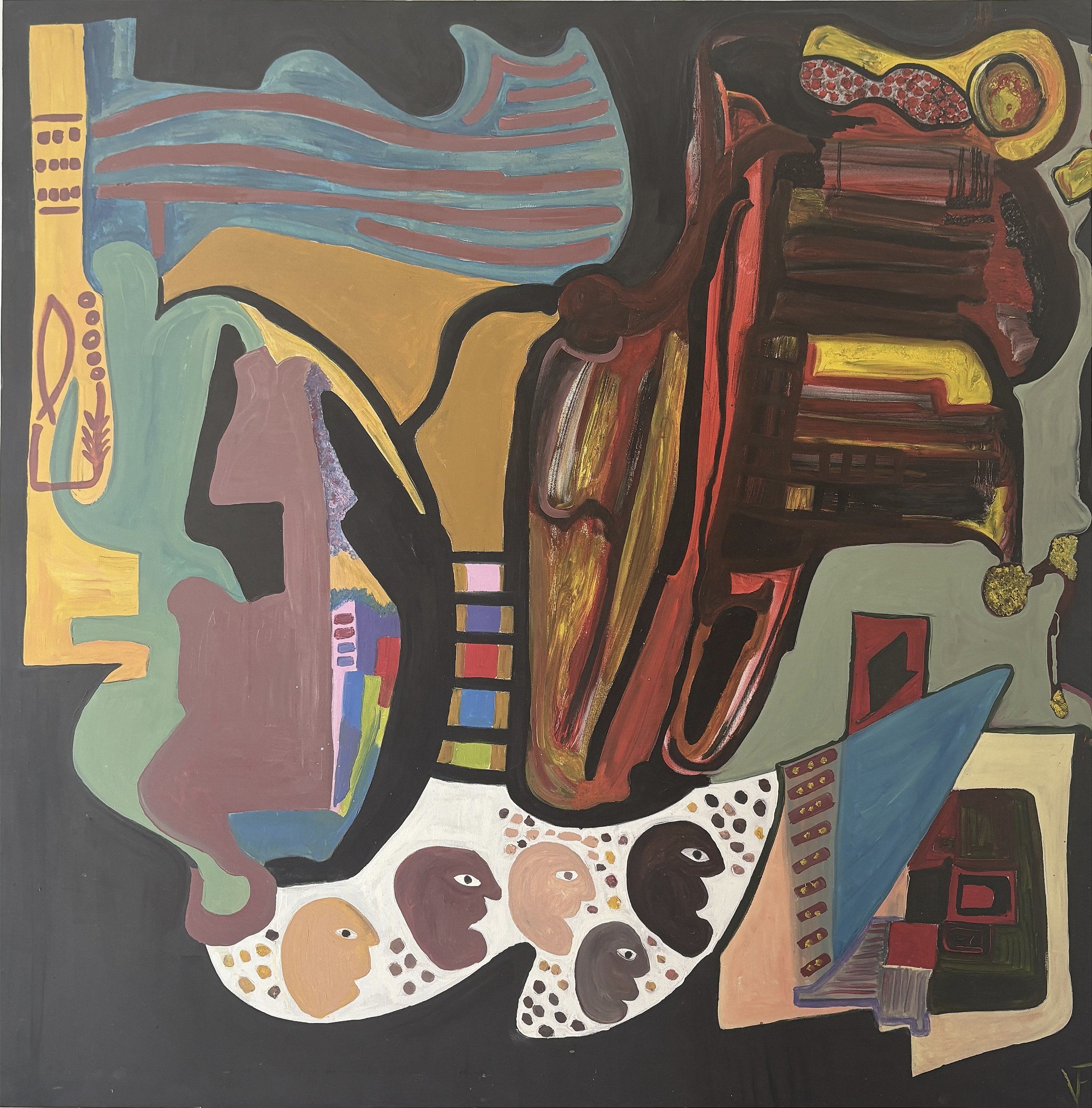 The composition presents a complex and multifocal structure where stylized human figures, cultural symbols, and abstract patterns intertwine in a visual dance that suggests both movement and interconnection. The perfect square format of the canvas establishes a field of equilibrium where no direction predominates, creating a visual microcosm of cultural globalization. The artist demonstrates extraordinary technical mastery in the manipulation of different media, alternating between areas of traditional oil painting and incorporation of collaged elements, three-dimensional textures, and possibly textual references in multiple alphabets. This multimedia approach creates a pictorial surface of archaeological richness, where each area reveals new layers of meaning under prolonged observation, inviting a visual exploration that mirrors our navigation through contemporary cultural complexity.
