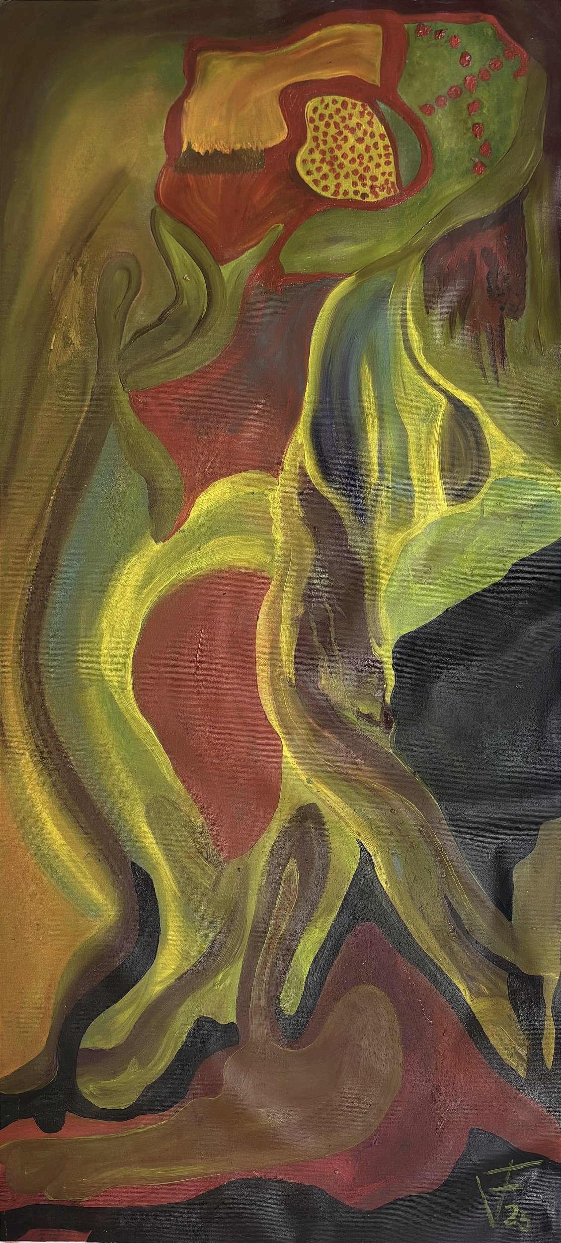 "DANCING FLOWER" transcends simple botanical representation to function as a visual metaphor for the vitality and resilience of life. The dancing flower can be interpreted as a symbol of the ability to find beauty and movement even in restrictive circumstances—a celebration of adaptability and authentic expression. On a deeper level, the work evokes the Taoist concept of wu-wei, the natural and spontaneous movement that arises when a being is in harmony with its essential nature. The canvas's elongated verticality suggests a connection between earth and sky, between necessary rootedness and transcendent aspiration, creating a visual tension that echoes the human existential condition.