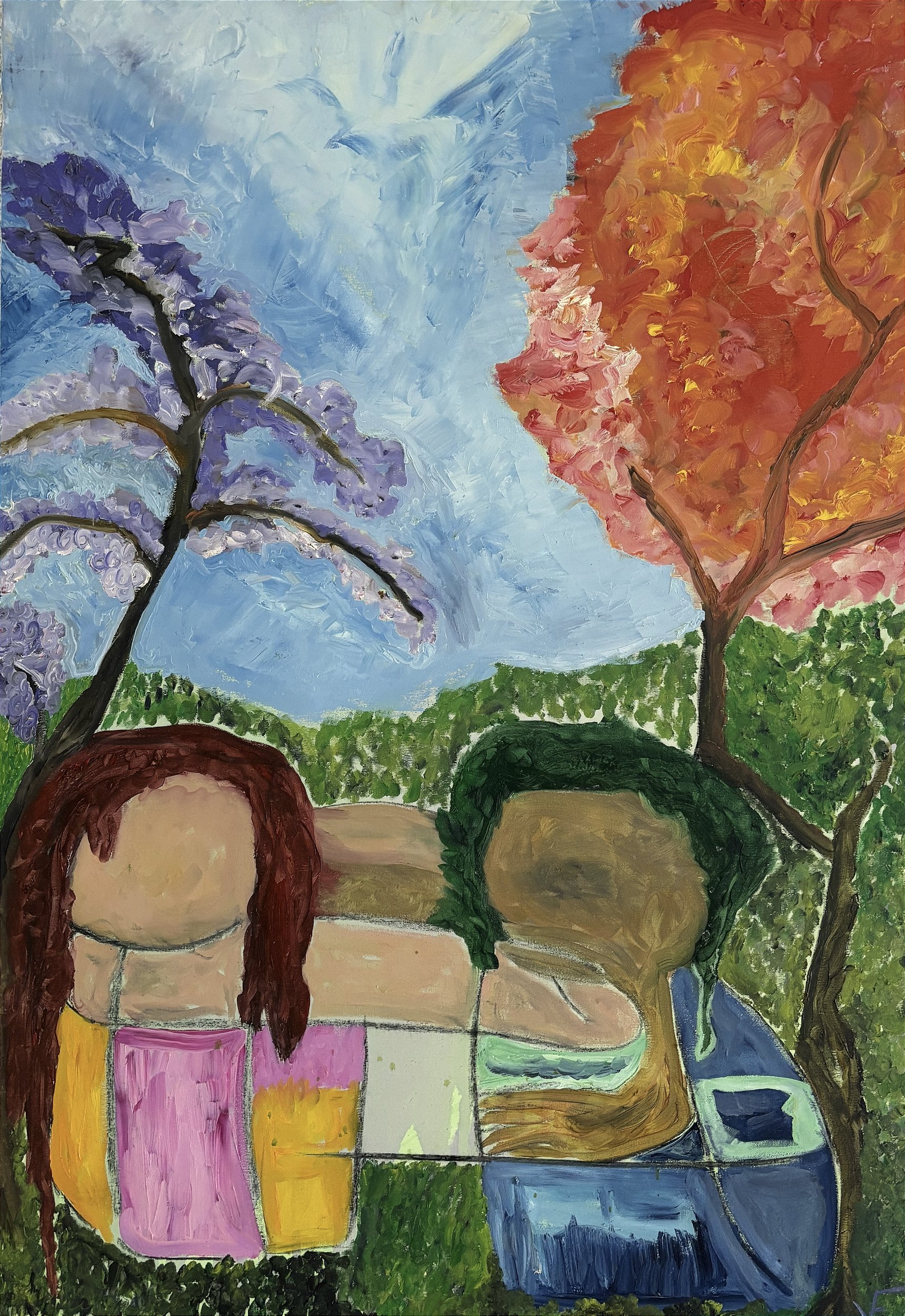 A composição apresenta duas figuras humanas estilizadas em um cenário natural, onde formas geométricas simplificadas se misturam com elementos orgânicos. As figuras são representadas com uma abstração que remete diretamente à maneira como crianças capturam a essência humana: formas básicas, proporções intuitivas e ausência de detalhes faciais específicos. O artista emprega pinceladas expressivas e blocos de cores vibrantes que criam uma tensão dinâmica entre representação e abstração, honrando a visão original da criança enquanto a eleva a um novo patamar estético.