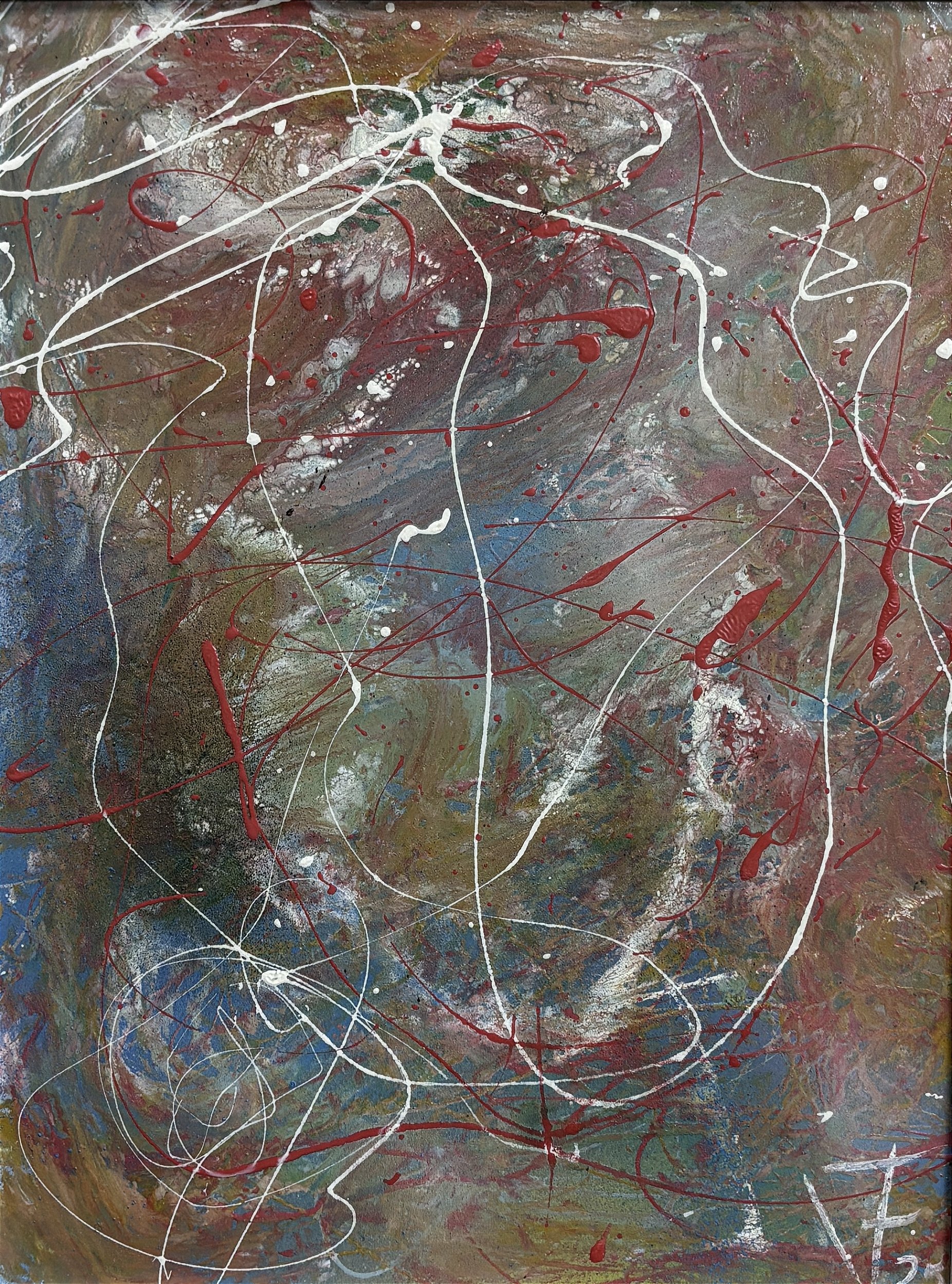 Estilo: O estilo situa-se firmemente no expressionismo abstrato gestual, com claras influências da action painting. Há ecos diretos de Jackson Pollock na técnica de gotejamento e na energia gestual, mas também de Willem de Kooning na intensidade cromática e na materialidade da tinta. A composição é dinâmica e não-hierárquica, criando um campo visual onde cada área compete pela atenção do observador. A paleta dominada por vermelhos intensos, brancos contrastantes e toques de outras cores cria uma atmosfera de urgência e intensidade emocional. O estilo celebra a espontaneidade controlada e a expressão direta da energia criativa, características fundamentais do expressionismo abstrato americano. A escala íntima intensifica o impacto visual, forçando uma confrontação direta entre obra e observador.