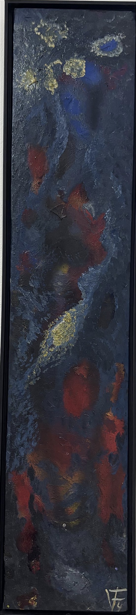 "DOORS OF HELL" presents itself as a work deeply rooted in contemporary Abstract Expressionism, with clear influences from Lyrical Abstraction and Cosmic Art. In this vertical canvas (100 cm x 20 cm), the artist uses a palette dominated by deep blues and blacks, punctuated by dramatic golden accents and incandescent reds. The mixed technique employed – oil, enamel, and varnish – creates a richly textured surface, where layers of paint overlap to form an almost three-dimensional space. The use of crackled textures and thick applications of paint suggests a materiality that invites the viewer to dive into the depths of the composition.