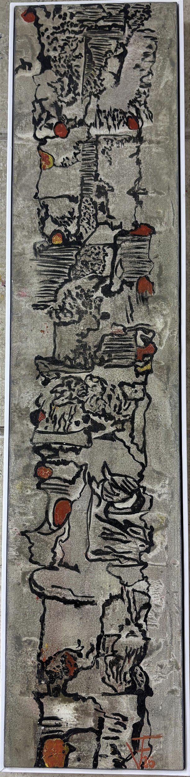The style particularly evokes Anselm Kiefer's work in material approach and Jean-Michel Basquiat's calligraphic gesturality. The elongated vertical composition references tribal and totemic art traditions, while the pictorial density dialogues with American Abstract Expressionism.