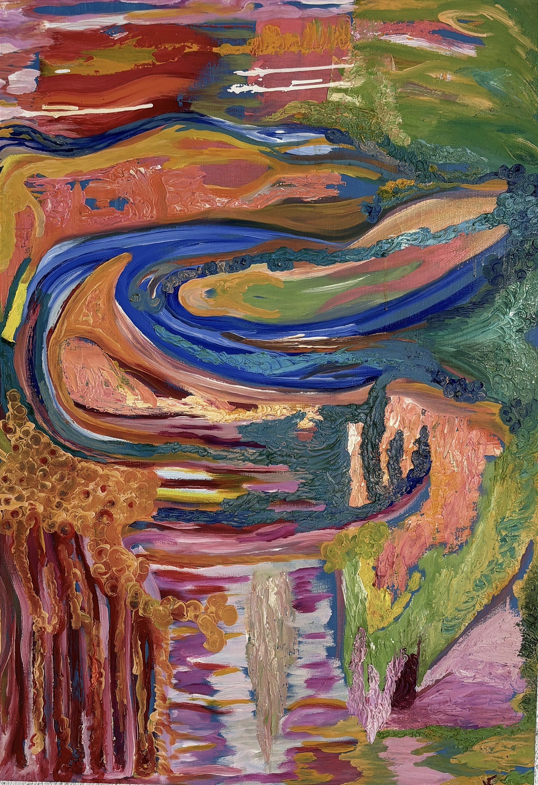 "HAPPINESS" emerges as a vibrant expression of contemporary lyrical abstractionism with influences from chromatic expressionism. This 100 x 70 cm work in oil on canvas presents a sensory explosion of colors that flow and intertwine in a dynamic visual dance. The exuberant palette, dominated by aquatic blues, vibrant greens, and accents of pink, orange, and golden yellow, creates an almost synesthetic effect, where color becomes materialized emotion. The artist employs fluid and gestural brushstrokes that move diagonally across the canvas, suggesting a downward movement that evokes the image of a waterfall or energetic current, symbolizing the natural and irrepressible flow of joy.
