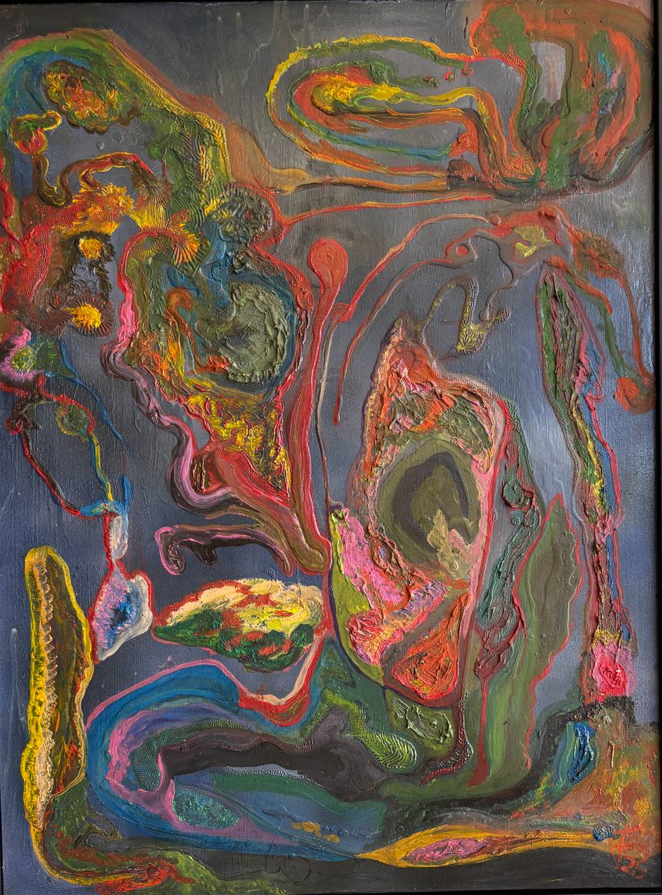 Estilo: Claramente enraizada no abstrato expressionismo, "FLOATING FLOWERS" exibe as características definidoras de uma arte que prioriza a experiência interior e a expressão emocional sobre a representação mimética. O estilo é orgânico e lírico, embora com uma veia de intensidade quase brutal na aplicação da tinta. As formas, embora abstratas, sugerem vida vegetal em um estado de transformação ou metamorfose. Não há ponto focal definido, mas sim um movimento contínuo que guia o olhar através de um labirinto de cores e texturas. A paleta é rica e audaciosa, com vermelhos ardentes, amarelos vibrantes e verdes terrosos contrastando com azuis profundos e tons mais neutros do fundo, que servem para fazer as formas coloridas flutuarem e se destacarem. É um estilo que celebra a materialidade da tinta, a ação da pintura em si, e o resultado final como um reflexo direto do inconsciente do artista.