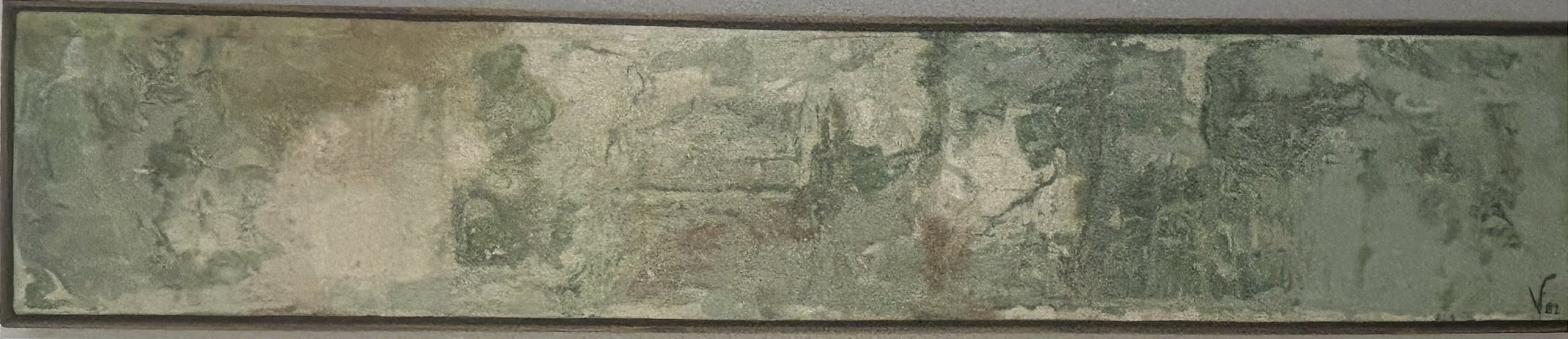 "GREEN MARBLE" presents itself as a remarkable work within contemporary abstractionism, with strong influences from materic art and abstract expressionism. The unusual panoramic format (35x135 cm) creates an expansive visual experience reminiscent of natural horizons. The combination of oil, enamel, and mixed media on canvas results in a richly textured surface that evokes the appearance of aged green marble. The discreet signature with the letter "V" and the date "62" suggests a work of artistic maturity, possibly created in 1962, dialoguing with artistic movements of that historical period.