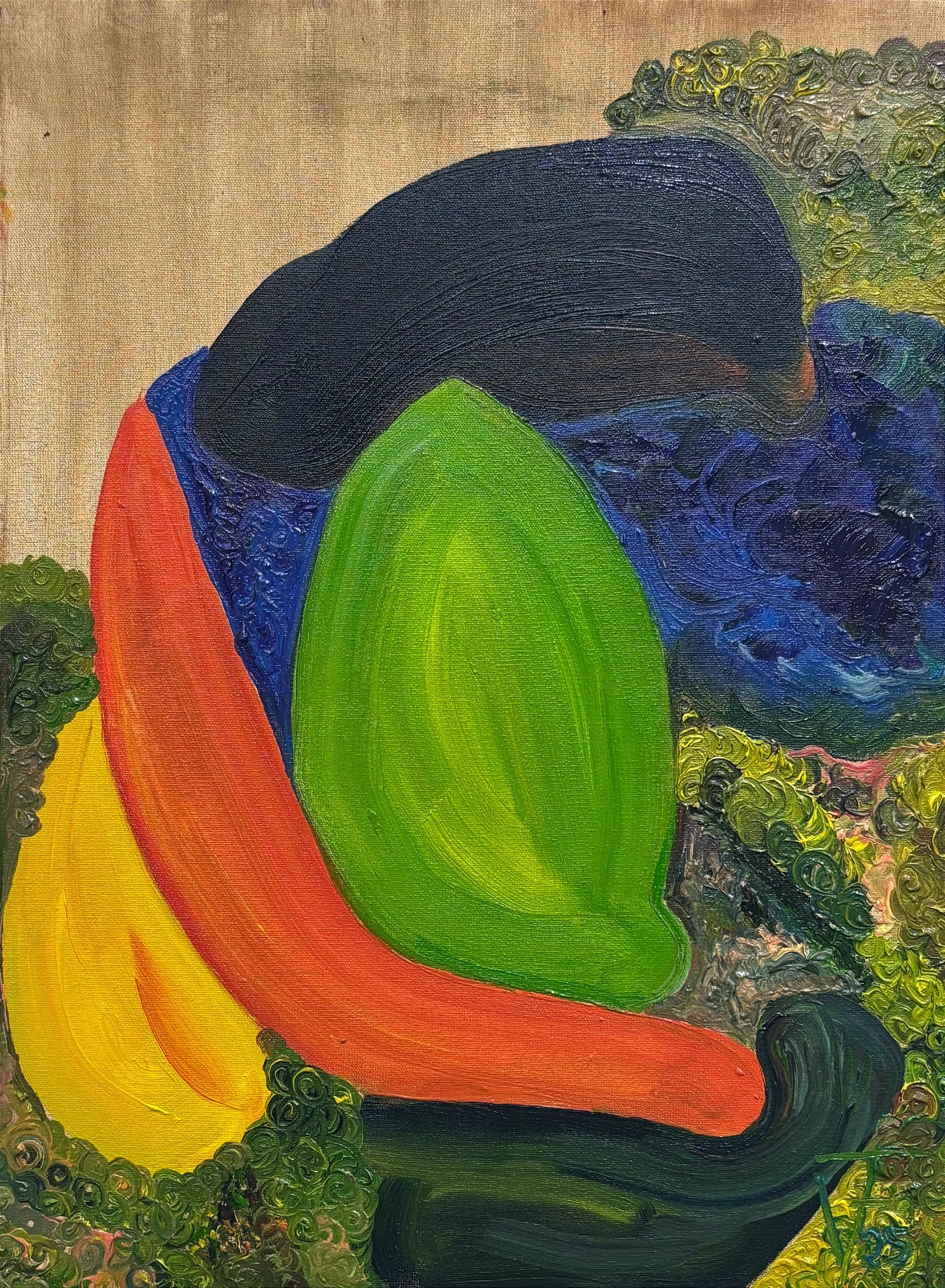 "HARVEST" apresenta-se como uma obra notável de expressionismo botânico contemporâneo, executada em óleo e mídia mista sobre canvas (60 cm × 40 cm). O artista estabelece um diálogo sofisticado entre a tradição da natureza-morta e sensibilidades abstracionistas contemporâneas, criando uma celebração visual da abundância que transcende a representação literal. A composição dinâmica é povoada por formas frutíferas estilizadas que ocupam o espaço pictórico com vitalidade orgânica – sugerindo maçãs, peras, romãs, uvas e outras frutas sem recorrer à mimese fotográfica. A paleta cromática é extraordinariamente vibrante e sazonal: vermelhos suculentos, laranjas terrosos, amarelos solares e verdes vibrantes dominam, complementados por toques de azuis e púrpuras que evocam sombras e profundidade. Esta sinfonia cromática não apenas descreve frutas específicas, mas captura a essência sensorial da colheita – aquele momento de plenitude e abundância que marca o ciclo agrícola. As pinceladas expressivas e gestuais criam um senso de movimento e energia vital que anima as formas, sugerindo não objetos estáticos, mas manifestações de processos naturais em constante transformação.