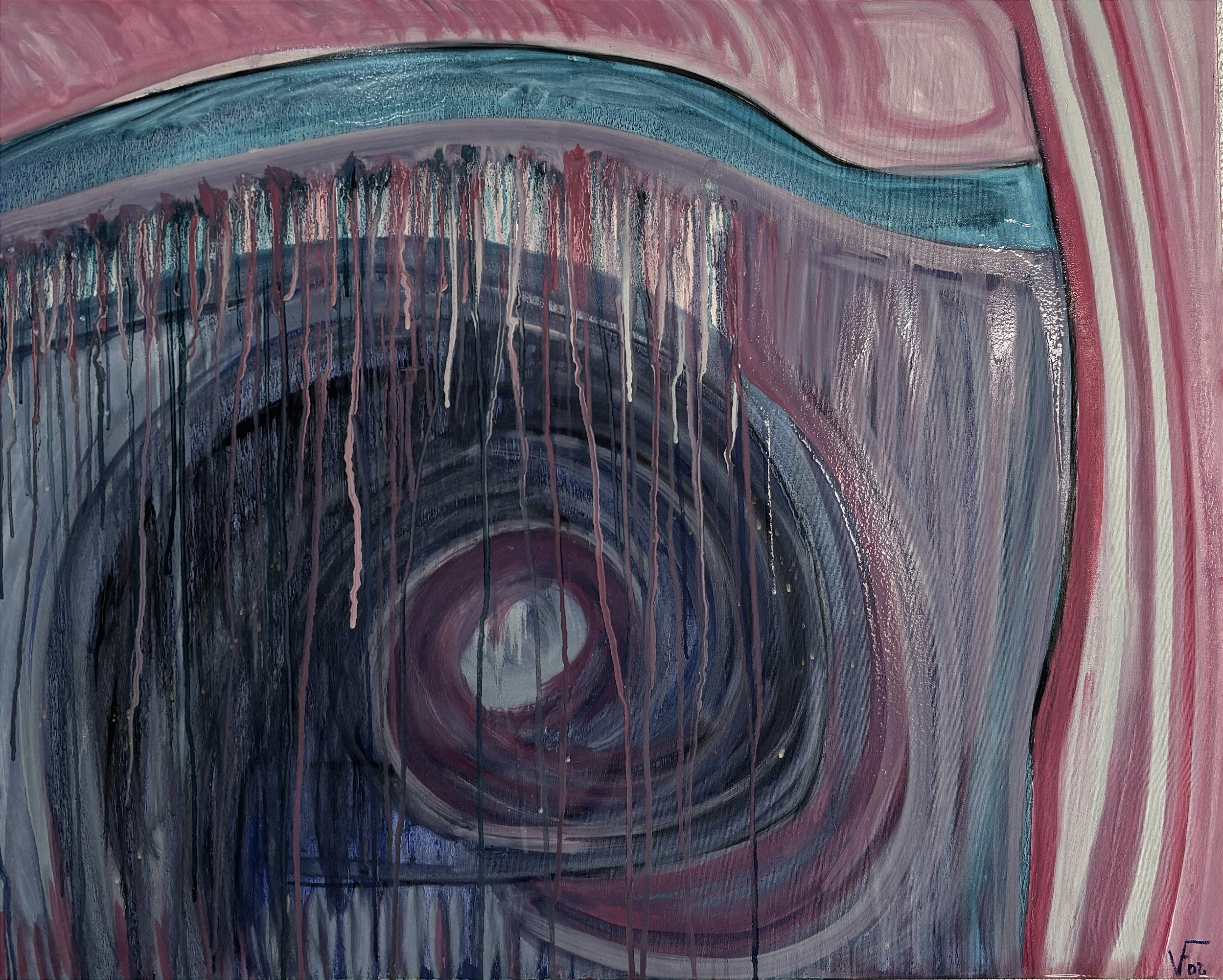 "HYPNOSIS" fits into the tradition of Contemporary Abstract Expressionism, with clear influences from the Vortex Movement and Lyrical Abstraction. The work presents a centrifugal composition dominated by a hypnotic vortex that draws the eye to its mysterious core. The chromatic palette favors shades of pink, purple, blue, and turquoise, creating harmonious transitions that evoke altered states of consciousness. The mixed technique employed by artist Voz (2022) combines fluid brushstrokes with textured applications, resulting in a surface rich in visual and tactile depth.