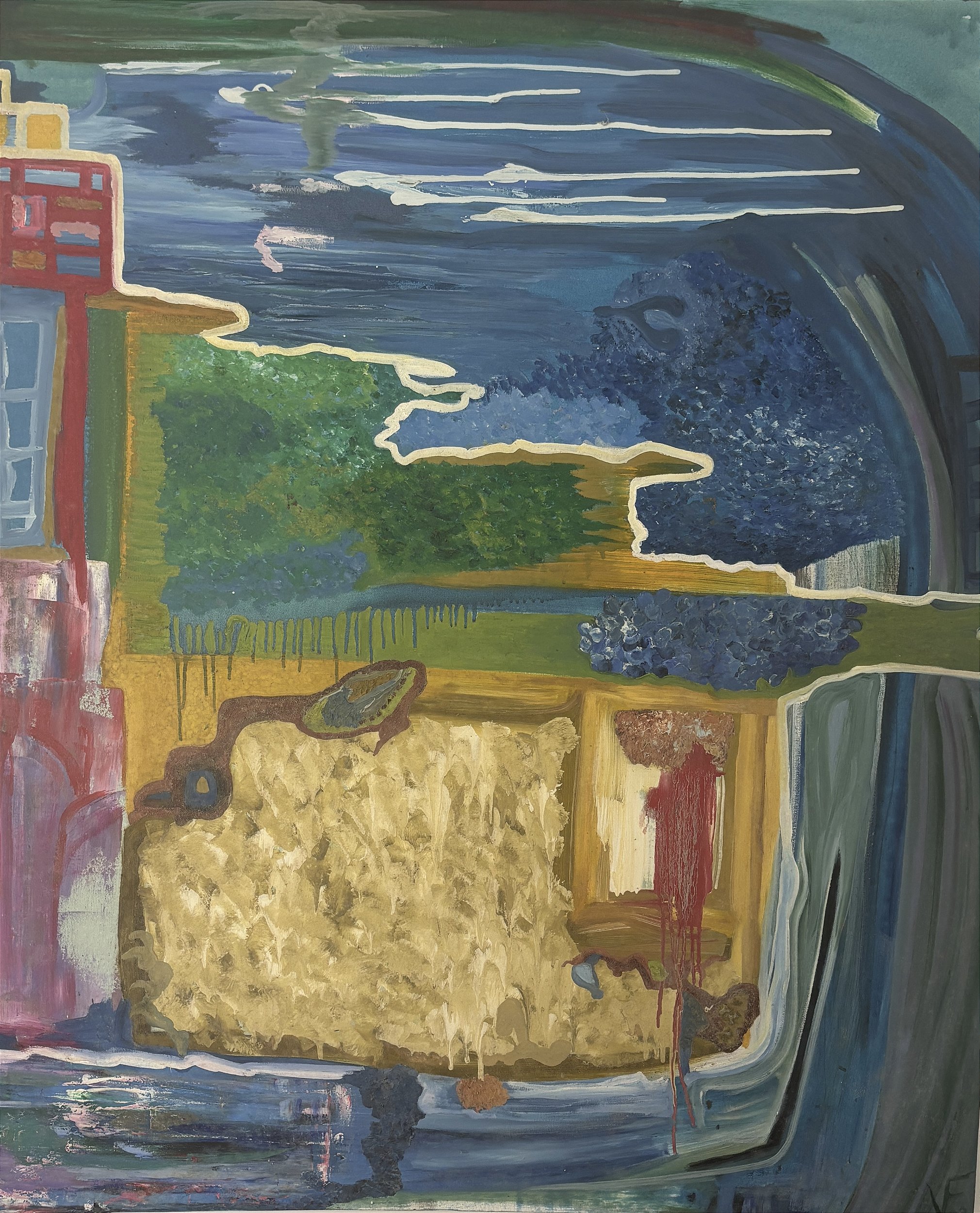The impact of "LAND BATHED BY RIVER AND SEA" is simultaneously sensory and meditative, operating through a visual immediacy that gradually unfolds into deeper reflections on natural cycles and ecological interconnection. The fluid composition and harmonious palette create a visual experience that mimics the very qualities of water – flowing smoothly between different areas of the canvas, inviting the gaze to follow courses and currents, to explore confluences and transitions. This subtle kinetic quality induces a contemplative state where boundaries between observer and observed begin to dissolve, mirroring the dissolution of boundaries between river and sea, land and water, represented in the work itself. For those familiar with specific fluvio-marine landscapes, the painting may evoke personal memories and associations; for others, it offers an archetypal vision that captures the universal essence of these elemental encounters. In both cases, "LAND BATHED BY RIVER AND SEA" invites a form of contemplation that reconnects the observer with fundamental hydrological cycles, offering an experience that is simultaneously aesthetic and ecological, contrasting with the fragmentation and disconnection characteristic of contemporary urbanized life.