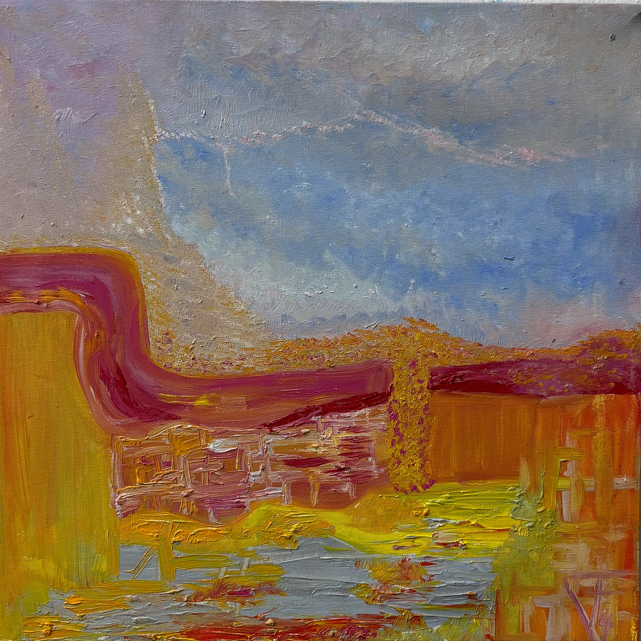 The technical execution reveals an exceptional mastery of the oil medium: dense layers of paint applied with various instruments – brushes, spatulas, possibly even direct application with hands – create a pictorial topography that mirrors the volcanic processes represented. Particularly notable is the treatment of the variable viscosity of the paint, where areas of magmatic fluidity contrast with textured impastos that project from the surface like solidified lava fragments. This tactile materiality invites the eye to traverse the surface like a geologist examining volcanic formations, discovering microcosms of chromatic interaction in each region of the canvas. The perfect square format (50 cm × 50 cm) functions as a field of contained forces, intensifying the explosive energy of the composition by restricting it within precise geometric limits – just as contained tectonic pressure eventually results in volcanic eruptions. The tension between internal chromatic chaos and external geometric order creates a visual dynamic that keeps the eye in constant movement between center and periphery, order and chaos, containment and release.