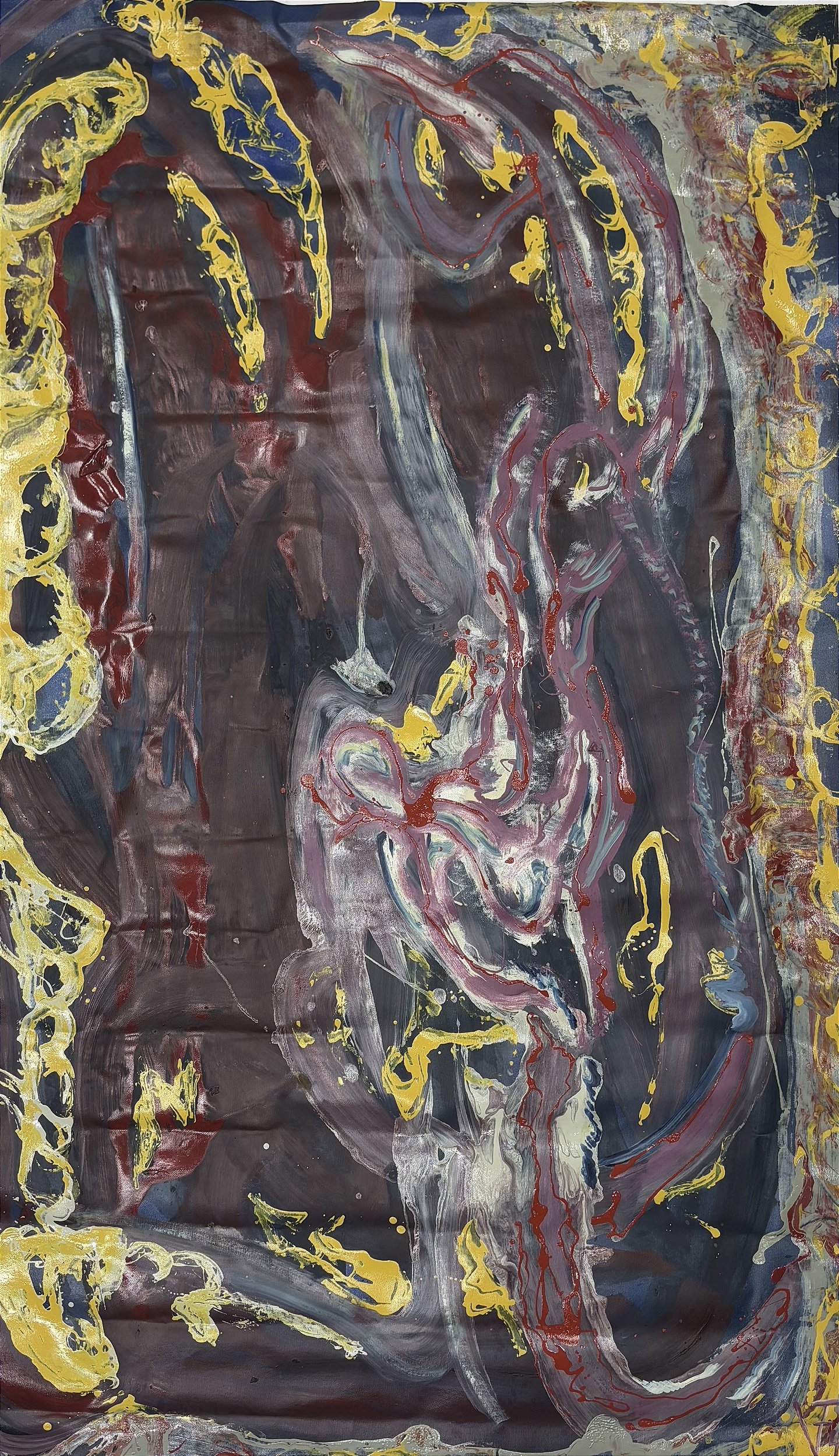 "ALIEN" presents itself as a monumental work that transcends conventional categories, establishing itself at the boundary between biomorphic abstract expressionism and contemporary cosmic surrealism. This imposing vertical composition (150 x 92 cm) executed in oil, enamel, and mixed media on canvas, creates a visual field of extraordinary tension between the familiar and the radically other. The pronouncedly vertical format simultaneously evokes an anthropomorphic figure and an interdimensional portal, inviting the viewer into a visual experience that destabilizes conventional perceptions of form and space.