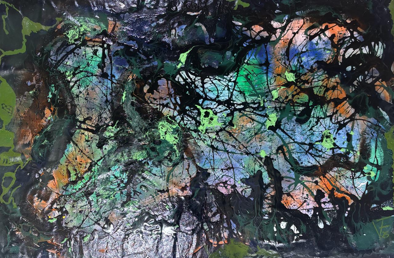 Technical Analysis The artwork "OIL SPILLAGE" is a large-scale canvas (114x163 cm) executed with enamel and oil paint, featuring an abstract and intensely expressive composition. The technique employed is fundamental to representing the theme of an oil spill. Enamel, known for its gloss and fluidity, is crucial for mimicking the viscosity of crude oil and its reflections on the water's surface. In conjunction with oil paint, it allows for the creation of a vast range of textures and densities.