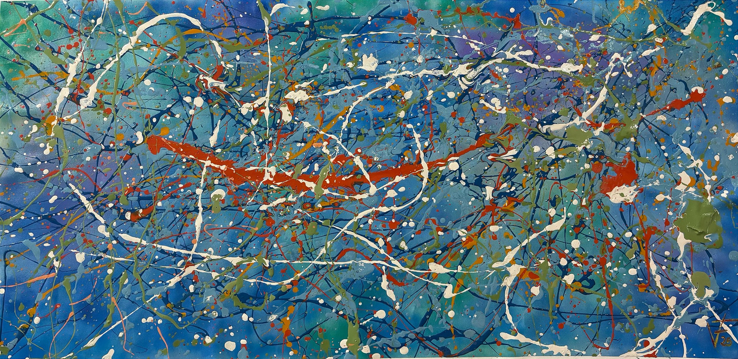 "PANDORA'S SKY" presents itself as a masterful work of contemporary cosmic bio-futurism, executed in oil, enamel, and mixed media on canvas in panoramic format (75 cm × 150 cm). Directly inspired by the visual universe of James Cameron's "Avatar," the work transcends mere cinematic reference to establish a sophisticated dialogue between the romantic tradition of the sublime landscape and contemporary digital aesthetics. The horizontally expansive composition evokes the vast alien skies of Pandora, with their floating formations and characteristic bioluminescence. The chromatic palette centers on deep blues, vibrant turquoises, and mysterious indigos, punctuated by luminous accents in shades of pink, violet, and gold that evoke the bioluminescent flora of the fictional planet. This chromatic symphony not only references the film but establishes its own visual language that oscillates between the recognizable and the alien, the terrestrial and the extraterrestrial. This representational duality creates a visual tension between the familiar and the other, inviting the viewer to reimagine their relationship with possible worlds beyond Earth.