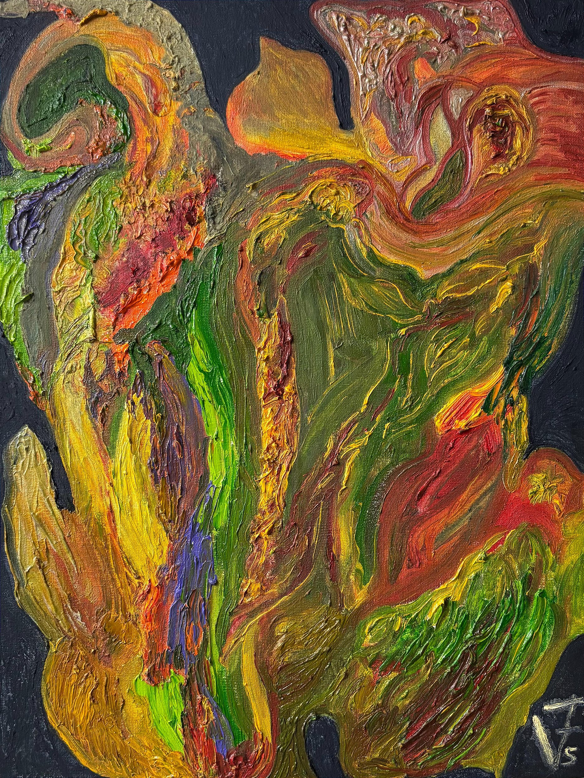 "PRIMORDIAL VORTEX" apresenta-se como uma obra extraordinária de expressionismo abstrato fluido, executada em óleo sobre canvas (40 cm × 30 cm). Esta composição dinâmica evoca a tradição dos pintores de turbulência como Turner e a energia gestual de Willem de Kooning, porém com uma sensibilidade contemporânea que dialoga com a estética do movimento neo-cosmológico. O artista emprega uma técnica de pinceladas circulares e espiraladas que criam um centro gravitacional visual poderoso, do qual emanam explosões cromáticas de amarelos incandescentes, vermelhos ardentes e verdes profundos, contrastando dramaticamente com um fundo negro abissal. Esta composição centrífuga captura o momento preciso de uma explosão cósmica primordial, sugerindo tanto o macrocósmico (nebulosas estelares, buracos negros) quanto o microcósmico (divisão celular, reações químicas), estabelecendo um diálogo visual entre as forças fundamentais que governam diferentes escalas da existência.
