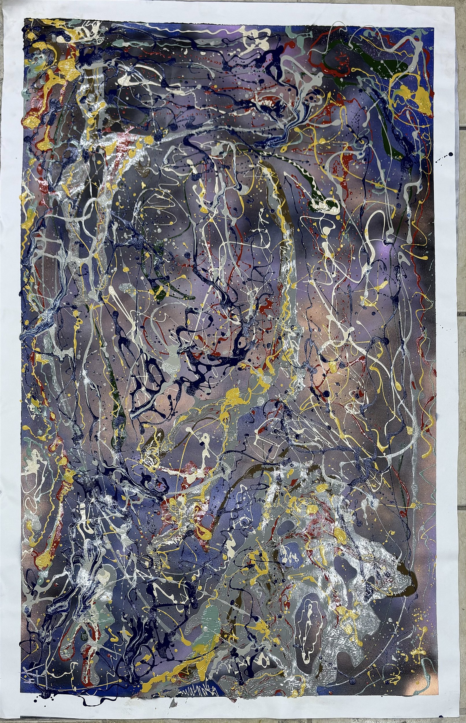"PURPLE GALAXY" (50 x 89 cm, óleo, esmalte e mídia mista sobre canvas) representa um exemplar extraordinário do Cosmismo Abstrato Contemporâneo, onde o artista traduz as revelações astronômicas do telescópio James Webb em uma experiência visual transcendente. A composição horizontal, deliberadamente panorâmica, convida o espectador a uma jornada imersiva através de um cosmos reinventado, dominado por uma paleta de púrpuras profundos, azuis cósmicos e dourados etéreos que evocam as imagens infravermelhas captadas pelo revolucionário telescópio. O movimento fluido das pinceladas e as camadas translúcidas de tinta criam uma sensação de profundidade infinita, reminiscente dos vastos campos estelares e nebulosas recentemente revelados à humanidade.