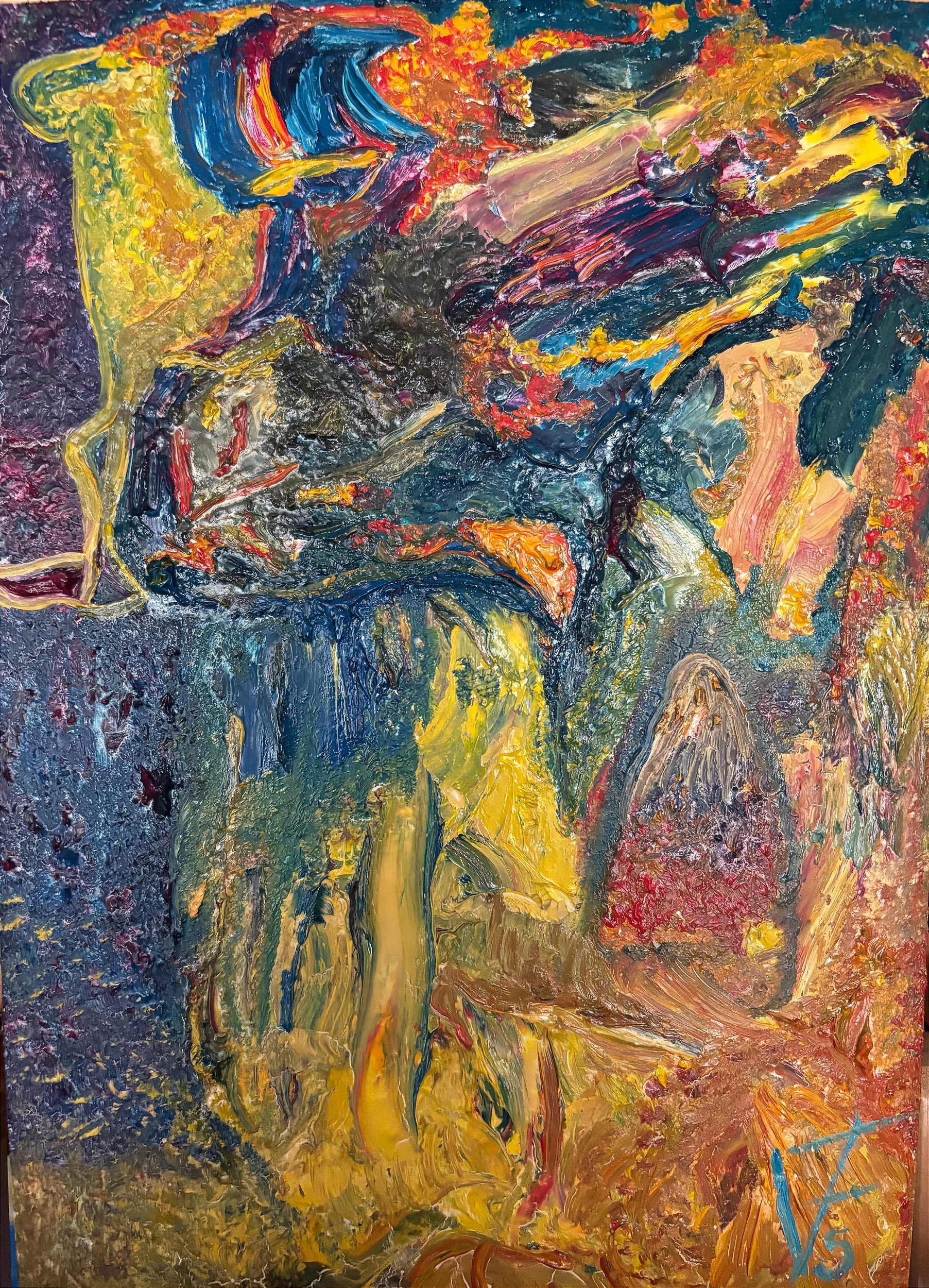 "RAINBOW DEER" presents itself as a contemporary abstract expressionist work, where the artist employs a vigorous impasto technique on hardboard. With intimate dimensions of 30 cm × 21 cm, the work uses oil and mixed media to create a chromatic explosion of vibrant yellows, deep blues, fiery oranges, and intense reds. The three-dimensional texture of thick, overlapping brushstrokes creates reliefs that capture and reflect light in distinct ways, giving dynamism and depth to the composition.