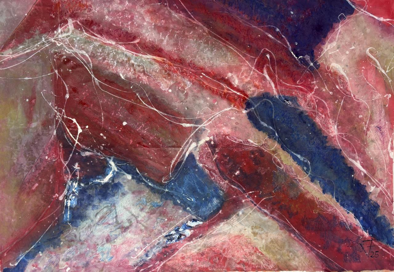 Análise Técnica A obra "RED AND BLUE STRIPS" é uma tela de dimensões consideráveis (93x138 cm), onde a composição é dominada por grandes massas de cor que se entrelaçam e se sobrepõem de forma dinâmica e abstrata. A paleta é predominantemente composta por tons de vermelho e azul, em clara alusão ao título e à bandeira dos Estados Unidos da América. O vermelho varia de tons vibrantes e saturados a nuances mais escuras e terrosas, enquanto o azul oscila entre um índigo profundo e áreas mais luminosas. O branco, aplicado em finas linhas e salpicos, desempenha um papel crucial, adicionando contraste, brilho e uma sensação de efervescência. Há também a presença sutil de tons de cinza, ocre ou amarelo pálido, que emergem do canvas não preparado ou se misturam com as camadas de tinta, adicionando complexidade e nuances à paleta.