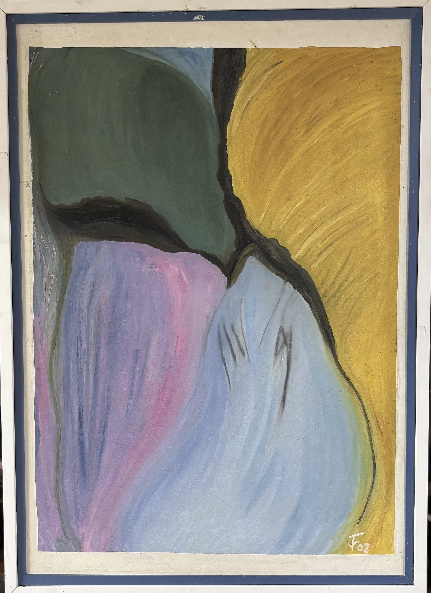The oil technique is explored in all its versatility, from translucent glazes that reveal underlying layers to dense impastos that project from the surface of the canvas. Particularly notable is the treatment of the central area, where the artist seems to have literally torn the paint to create a visual fissure that functions as the organizing axis of the composition. This almost sculptural approach to painting transforms the canvas into a tactile field where the materiality of the paint mirrors the materiality of flesh, creating a synesthetic experience where the visual evokes tactile sensations. The verticality of the work (120 cm) reinforces the anthropomorphic reading, inviting a direct bodily identification between viewer and painting.