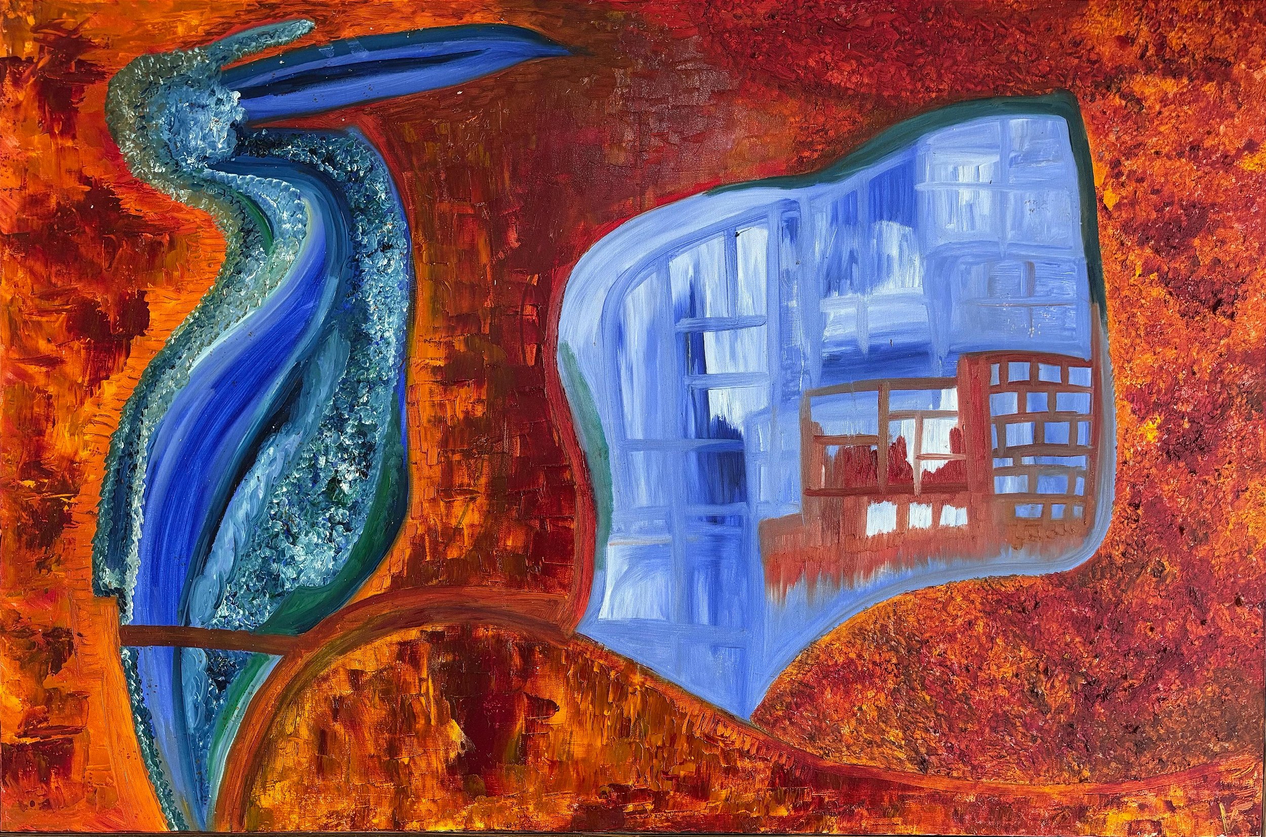 "SEARCHING A WAY OUT" se insere na tradição do Expressionismo Abstrato Contemporâneo com influências da cartografia conceitual e do automatismo surrealista. Esta obra horizontal de 80 cm x 120 cm apresenta uma composição dinâmica dominada por uma rede de linhas brancas e amarelas que serpenteiam através de um fundo de azuis profundos, vermelhos terrosos e áreas de negro aveludado. A composição cria uma tensão visual entre estrutura e caos, onde formas que evocam mapas, labirintos e redes neurais se entrelaçam em uma dança visual que sugere movimento perpétuo. Particularmente notável é o contraste entre as áreas de densidade cromática e os espaços de respiro contemplativo, criando ritmos visuais que guiam o olhar em uma jornada através da tela.