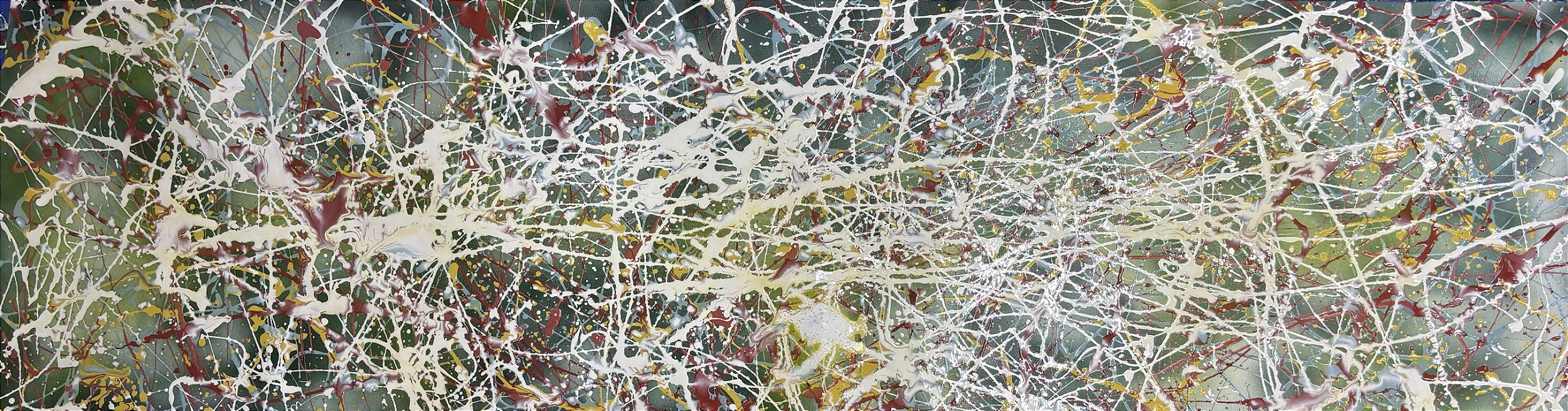 Technical Analysis The artwork "SPRING" presents itself as a vibrant example of abstract painting, heavily influenced by action painting or drip painting techniques. The elongated horizontal format (52x186 cm) suggests a panoramic view, inviting the observer to a total immersion in the complexity of the surface. The composition is characterized by a dense network of enamel lines and splatters, which overlap and intertwine, creating a rich visual texture and a sense of incessant movement.