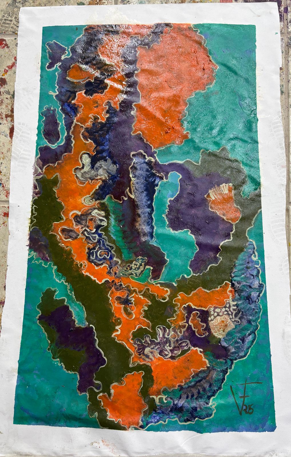 Estilo: O estilo situa-se firmemente no abstracionismo lírico contemporâneo, com fortes influências do expressionismo abstrato e do tachismo. As formas biomórficas que se entrelaçam e se separam evocam paisagens vistas de grande altitude, formações coralíferas, ou mesmo estruturas microscópicas da vida marinha. A paleta cromática é cuidadosamente orquestrada: o azul-esverdeado dominante serve como matriz oceânica, enquanto os laranjas vibrantes, roxos profundos e verdes terrosos criam pontos de tensão e energia. Não há hierarquia focal tradicional; em vez disso, a composição flui organicamente, convidando o olhar a navegar pela superfície em um movimento contínuo. O estilo celebra a materialidade da tinta enquanto evoca experiências sensoriais e memórias afetivas, características do melhor abstracionismo lírico.