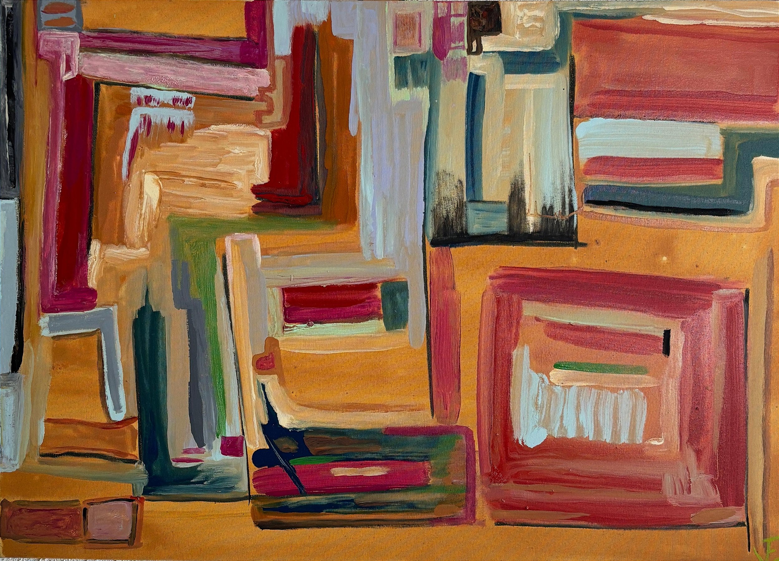 "UNNAMED 3" is a notable example of contemporary abstract art, conceived in oil, enamel, and mixed media on canvas, with expressive dimensions of 100x70 cm. The work stands out for its complex overlapping of geometric forms and the intentional use of vibrant colors — shades of ochre, red, orange, blue, green, and pink coexist in harmony and contrast, promoting a dynamic visual dialogue.