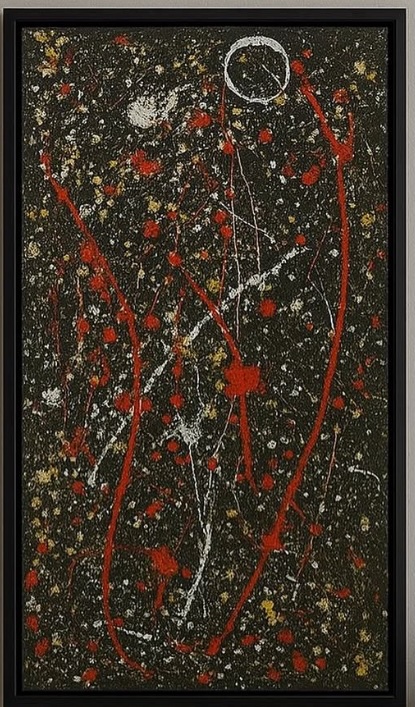 Análise Estilística. "UNIVERSO CÓSMICO" adere fortemente aos princípios do Expressionismo Abstrato, especificamente à técnica de Action Painting. O artista utiliza a tela como um campo de batalha ou um palco onde a tinta é derramada, gotejada e salpicada com grande espontaneidade e energia. Isso não apenas cria a imagem, mas também registra o processo físico e emocional do artista. As características de gotejamento e salpicos (dripping e splattering) estabelecem uma clara conexão com a linguagem de artistas como Jackson Pollock, onde o gesto é primordial e a obra é um registro da performance. A paleta vibrante e o contraste acentuado entre o fundo escuro e as cores luminosas são elementos-chave do Expressionismo Abstrato, que valoriza a cor como veículo de emoção e a linha como expressão de força vital. Embora não siga uma representação figurativa, a obra comunica uma intensa emoção e uma visão subjetiva do cosmos. A presença de um elemento estrutural como o círculo branco, em meio à aleatoriedade dos respingos, adiciona uma dimensão de equilíbrio e talvez uma "assinatura" visual que distingue a obra dentro do gênero. A peça, criada em 2025, demonstra a perenidade e a adaptabilidade do Expressionismo Abstrato para explorar temas grandiosos e atemporais, utilizando uma linguagem visual que se mantém relevante e impactante na arte contemporânea.
