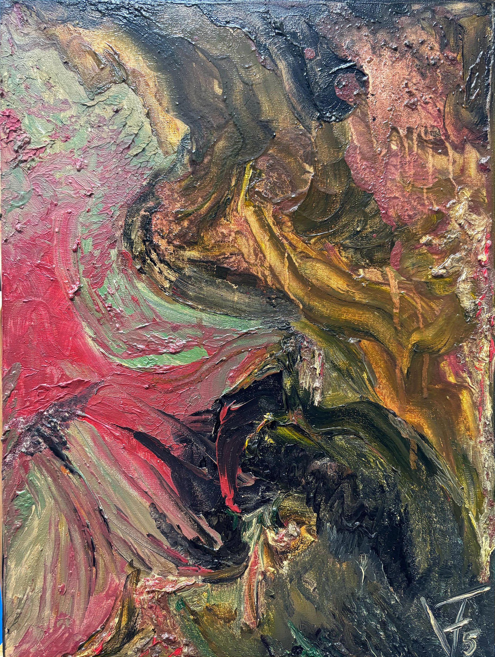 A composição diagonal da obra cria uma sensação de movimento ascendente, partindo do canto inferior esquerdo com formas ondulantes em vermelho e rosa, que se elevam e se deslocam para a direita, mergulhando em verdes mais escuros e negros. O ponto focal se estabelece na convergência central de cores, onde preto e dourado colidem em um redemoinho quase vorticial. Esta estrutura compositiva não apenas guia o olhar através da tela, mas também sugere uma narrativa de transformação - talvez de caos para ordem, ou de materialidade para transcendência.