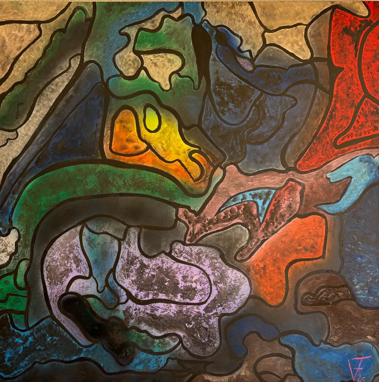 Technique Used: The technique employed is marked by boldness and an exploration of the materiality of oil paint. The brushstrokes are visibly textured in several areas, suggesting the application of generous layers of pigment or the use of a palette knife, which lends an organic quality and a tactile sensation to the surface. The thick, dark, almost labyrinthine outlines are the backbone of the composition, acting as both barriers and connectors that delimit and intertwine the distinct blocks of color. This "compartmentalization" technique, at first glance, recalls the aesthetic of stained glass or cloisonné, but with an execution that is deliberately rawer, more visceral, and less polished, in tune with the urban theme. The variation in saturation and luminosity within each colored "cell" demonstrates a subtle control over the paint, allowing light to dance across the textures and create depth.