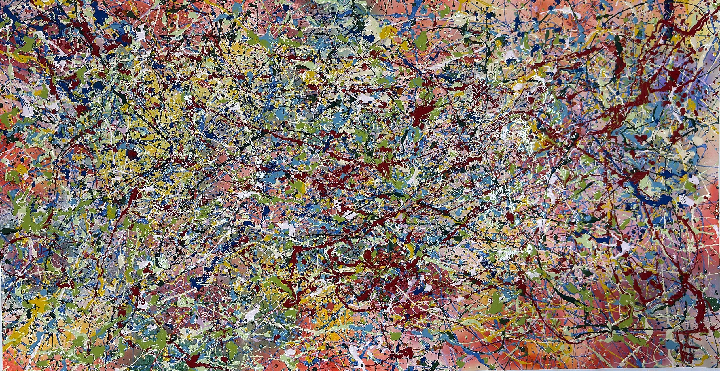 The painting "WATERCOLOR," oil on canvas measuring 90 x 180 cm, immediately impacts viewers with its large format and the visual lightness evoked by its title. Despite the traditional oil technique, the artist masterfully simulates the fluid and translucent effect typical of watercolor, giving the work an innovative character within lyrical abstract expressionism.