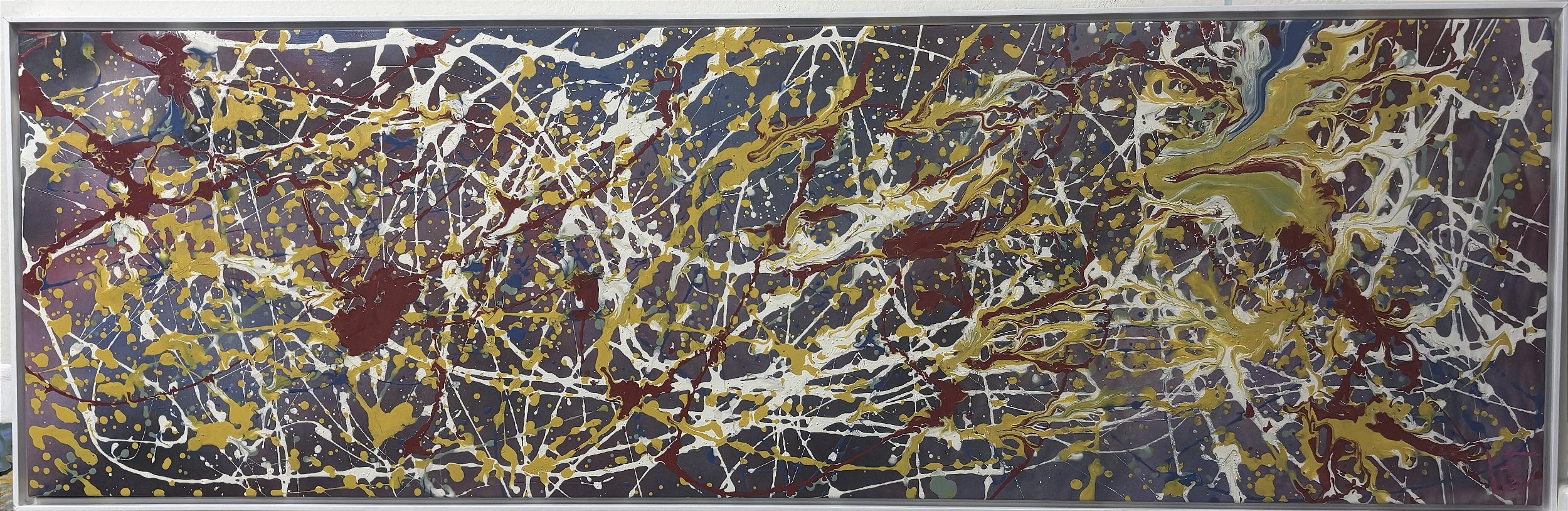 "WHITE AND RED STORM", óleo sobre tela com dimensões de 46x144 cm, insere-se de maneira audaciosa no movimento do expressionismo abstrato contemporâneo. O formato retangular alongado dessa obra favorece a sensação de fluxo e intensidade, elementos amplificados pelas explosões de branco e vermelho que percorrem horizontalmente toda a superfície, remetendo à energia incontrolável de uma tempestade.
